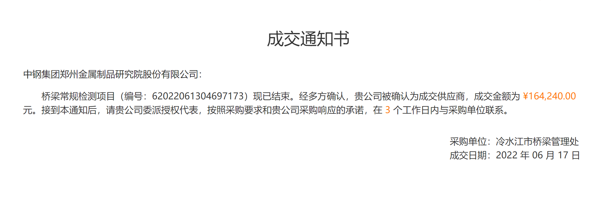 摘要:中鋼集團鄭州金屬制品硏究院股份有限公司中標湖南冷水市橋梁常規檢測項目